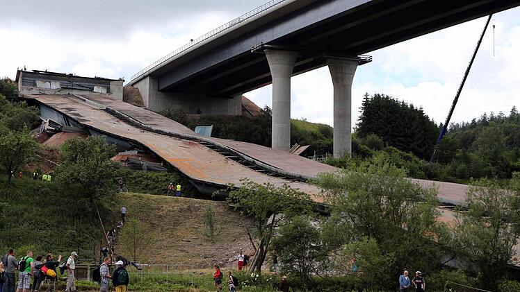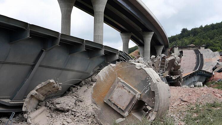 Jan Bluhm von der Autobahndirektion Nordbayern führt einen Journalisten unter die gesprengte Sinntalbrücke. Bluhm ist zufrieden, wie alle seine Kollegen. "Alles hat wunderbar geklappt. Die Brücke ist genau so gefallen wie sie sollte, genau auf die 'Fallbetten', die dafür vorbereitet waren.