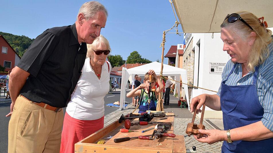 Wenige Meter weiter hatte Annemarie Leuschner, Hobbymarketenderin aus Zahlbach, einen Mitmachstand aufgebaut, der aber nicht nur die Kleinen interessierte. Viele Erwachsene ließen sich von der 65-Jährigen die zusammengetragenen Werkzeuge von Schreinern und Tischlern zeigen. Das älteste Modell ihrer Sammlung war ein Stellmaß aus dem 17. Jahrhundert. Besonders interessant waren auch die Nachbauten mittelalterlicher und steinzeitlicher Werkzeuge.