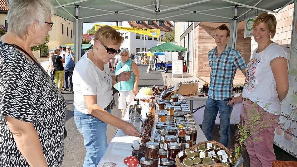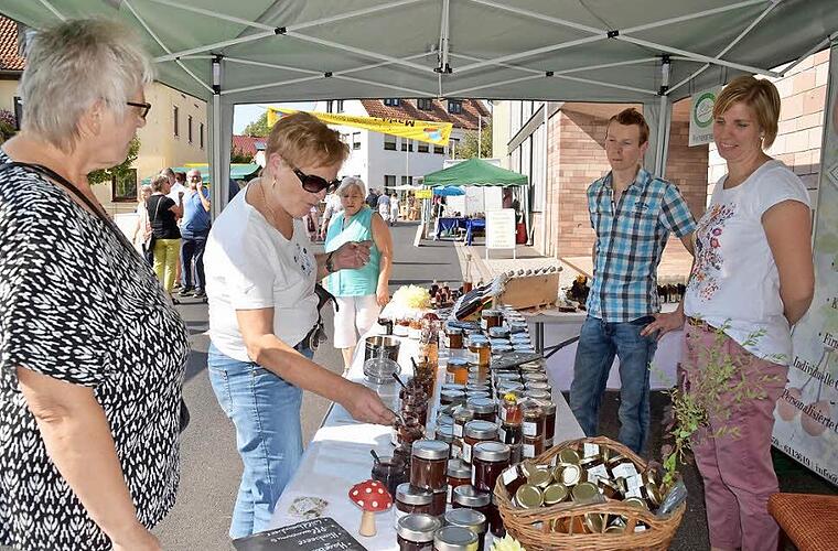 Unschlüssig stehen die beiden da. Sollen sie nun Marmelade mitnehmen oder nicht. Schließlich greifen Susanna Faber und Maria Schmitt zu den angebotenen Brotwürfeln und bestreichen diese mit dem süßen Aufstrich. Rhöner Rosenblüte, Flieder oder Löwenzahn? Die Auswahl ist groß und außergewöhnlich. Den beiden Damen aus Nickersfelden gefällt sie, obwohl ihnen nicht jede Geschmacksrichtung zusagt. "Die Hagebuttenkonfitüre haben wir früher auch immer selbst gemacht. Das ist schon eine Arbeit", erzählt Susanna Faber. Dann erkundigt sie sich, wie Erzeuger Markus Wingenfeld aus Eichenzell das "Hiffenmark" herstellt.