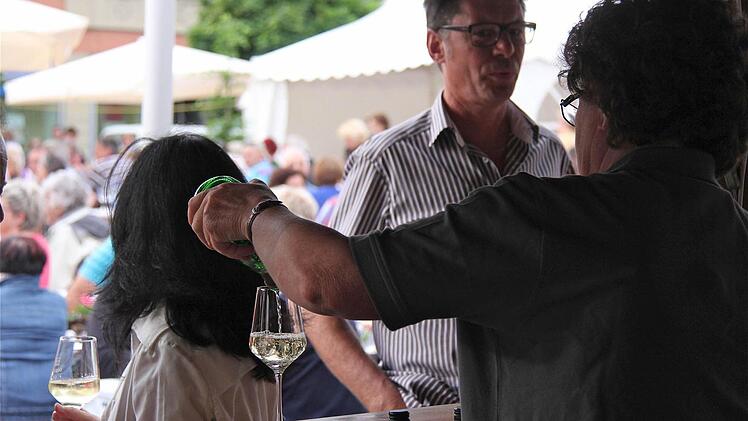 Auf dem Marktplatz gibt es kaum noch einen freien Platz, die "Spreublöäser" sorgen mit urigen Rhöner Klängen für gute Stimmung. "Ich freue mich über die tolle Besucherresonanz", strahlt Stefan Ruppert, Vorsitzender des Weinbauvereins. Bürgermeister Ernst Stross begrüßt nicht nur die Gäste, sondern auch die Störche auf dem Rathaus: "Wir sind jetzt auch eine Storchenstadt geworden." Die Weinprinzessinnen Antonia Müller aus