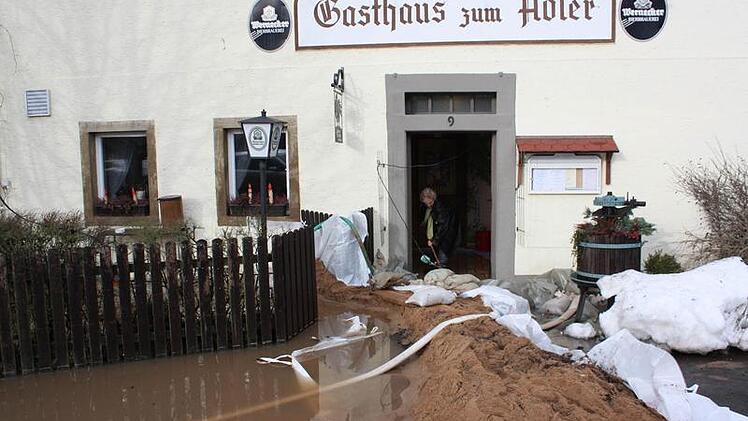 Beim nicht unterkellerten Gasthaus drückte es das Wasser durch die Wände, sagte Gastwirt Dieter Göbel. Für ihn war es das erste Hochwasser, seit er den "Adler" übernommen hat.