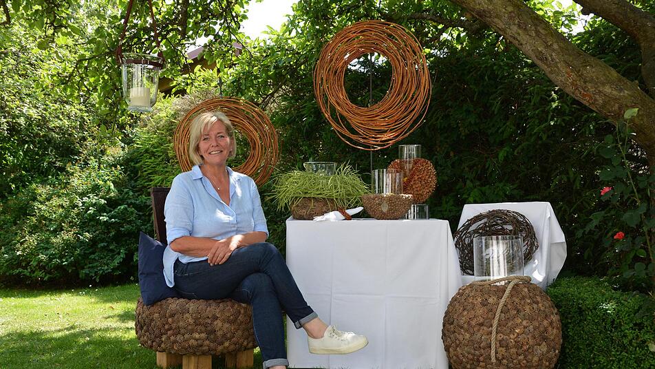 Seit mittlerweile zwölf Jahren stellt sie auch auf Kunsthandwerkermärkten aus, erstmals war sie in diesem Jahr auch beim Fürstlichen Gartenfest im Schloss Fasanerie in Eichenzell mit dabei. "Hier galt es zuerst einen Bewerbungsprozess zu durchlaufen, man musste Bilder und Arbeitsproben schicken und erklären, wie man die einzelnen Objekte herstellt", berichtet die Künstlerin. Damit demonstrierte man, dass wirklich alles handgefertigt ist und der jeweilige Kunsthandwerker seine Sache versteht. Martina Straub hat dort gebundene Flussweidenkränze gezeigt, einen Kirschkranz, wobei sie Wert darauf legte, dass diese nicht gewässert wurden. "Um sie zu binden muss man den richtigen Zeitpunkt erwischen, an dem man sie schneidet: dann ist die Verarbeitung überhaupt kein Problem, man muss nur mit der Natur gehen", erklärt sie. Fehlen durfte dabei auch ein Kranz aus geflochtenem Raps nicht, bei dem die Schoten dauerhaft fest bleiben, aber auch der Stuhl aus Kiefernzapfen und eine Schale aus Bucheckernkapseln war dort zu sehen. "Ich war schon froh, dass ich dort ausstellen durfte. Als dann eine Jury zur Beurteilung kam, war ich schon etwas aufgeregt", erinnert sich Martina Straub. Als ihr dann jedoch der "Produktpreis Objekt, Kunst und Möbel" für die "handwerkliche und ästhetische Arbeit mit Naturmaterialien" verliehen wurde, war sie überrascht und überglücklich. "Ich habe mich riesig darüber gefreut." Die Juroren haben gesagt, dass sie die Art von Kunsthandwerk, die sie mache, in dieser Form noch nicht gesehen haben. "Da ist man dann schon stolz auf die eigene Arbeit", meint Martina Straub.