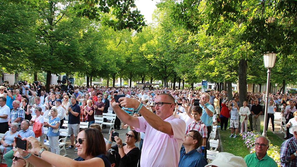 "Was für ein wunderschöner Anblick", Angela Merkel wählte für den Beginn den Smalltalk und würdigte den Bad Kissinger Kurgarten als "Kleinod". Das gefiel den Zuschauern. Immer wieder gab es Zwischenapplaus, Pfiffe kamen nur ganz vereinzelt. In der Menge wurden Merkel-Plakate hochgehalten.