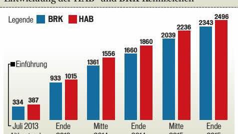 Seitdem hat der Trend zum Schilderwechsel zwar erheblich nachgelassen: 57 wechselten 2014 auf HAB, 55 auf BRK, im vergangenen Jahr waren es nur noch jeweils 24.