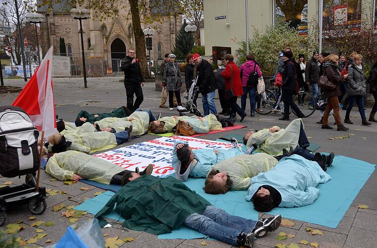 So nannte sich der Flashmob nicht nur "Pflege am Boden": Für rund zehn Minuten gingen die Beschäftigten selbst zu Boden. Exakt um fünf Minuten vor zwölf legten sich die Akteure auf den Boden und entrollten ihr Spruchband "Die Pflege liegt am Boden - deshalb muss die gesetzliche Personalbemessung in den Koalitionsvertrag", forderten sie. Nach 20 Minuten war der Spuk zu Ende, die Aktion löste sich wieder auf, wie in vielen anderen Städten auch.kpr