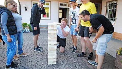 Großes Gelächter, Anfeuerungsrufe und teils akrobatische Verrenkungen von acht jungen Erwachsenen sind vom Platz vor dem Pfarrheim zu hören und zu sehen.