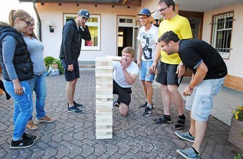 Seit vielen Jahren finden sich die ehemaligen Ministranten ab Juni zusammen und bereiten die Zeltlagerwoche vor. Da wird gebaut, so wie das eben ausprobierte Riesen-Jenga-Spiel, das Florian Heublein gezimmert hat, da werden Spiele zusammengesucht und manchmal auch neu erfunden.