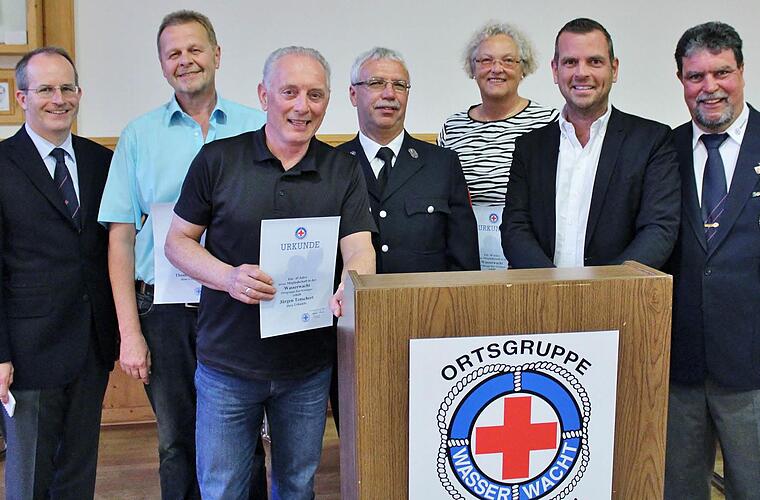 Wasserwacht-Ortsgruppe Bad Kissingen jetzt vergeben: G7 Nadel - Barbara Hartmann; 40 Jahre Mitgliedschaft: Willi Führer; 45 Jahre: Thomas Bischoff sowie Thomas Deeg und Jürgen Tenschert; 50 Jahre: Gisela Leuschner und Brigitte Jung.