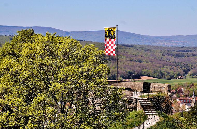 Weil eine Burg ohne Fahne nicht lebt, schmückt der Heimatverein Botenlauben in Reiterswiesen die beiden Türme der Festungsruine Botenlauben seit zwanzig Jahren mit dem Wappentuch des Otto von Botenlauben. Von Ostern bis zum Oktober grüßen die Farben der Henneberger das Dorf und die Kurstadt. Bernhard Thomas, Fahnenbeauftragter des Heimatvereins sorgt dafür.