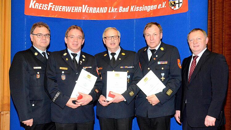 Deutsches Feuerwehrehrenkreuz in Bronze: Die drei Kreisbrandmeister Elmar Eisenmann (Westheim), Oliver Lukaschewitsch (Fuchsstadt) und Christian Neugebauer