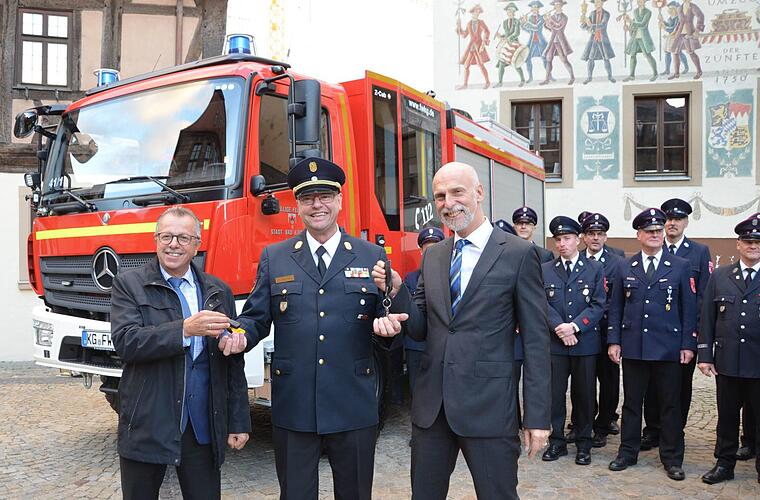 Zwar waren es drei Fahrzeuge, aber nur eines musste von der Stadt bezahlt werden. Kommandant und Stadtbrandinspektor Harald Albert erklärt das so: Das größte, ein Löschgruppenfahrzeug KAT S für rund 250 000 Euro, ist ein vom Innenministerium bezahltes Katastrophenschutzfahrzeug. In Farbe und Ausstattung ist es identisch mit den Löschgruppenfahrzeugen der Feuerwehren.
