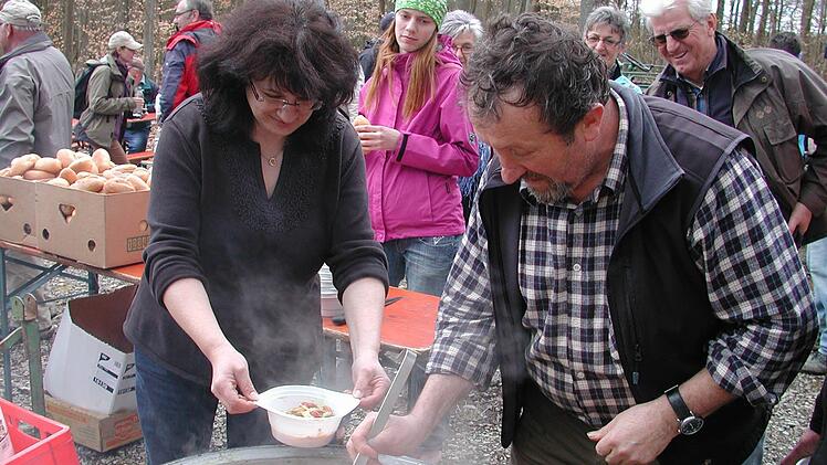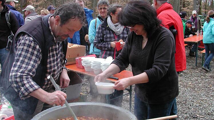 Gruppe stärkt sich In der Nähe der "Krummen Birke" gab es einen Eintopf, den Martina Greubel und Ludwig Hilpert zubereitet hatten.