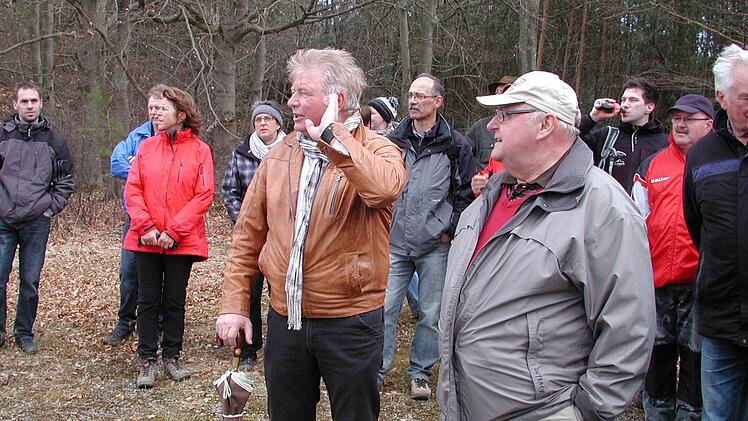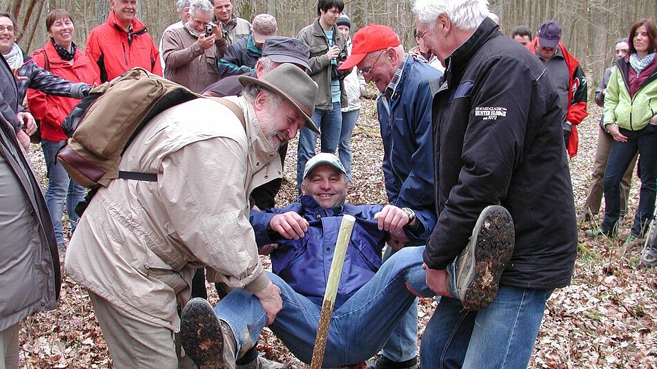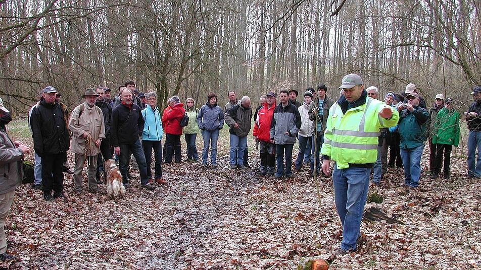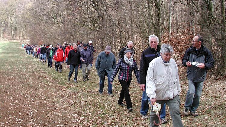 Nach sechs Kilometern spendierte Jagdpächter Volker Seyffahrt am "Donnerloch" eine Brotzeit. Erhard erinnerte an eine Legende, die erzählt, dass dort der heilige Kilian vom Kreuzberg auf dem Weg nach Würzburg vorbeigekommen sei und eine Eiche fällte, um die Machtlosigkeit der heidnischen Götter zu beweisen.