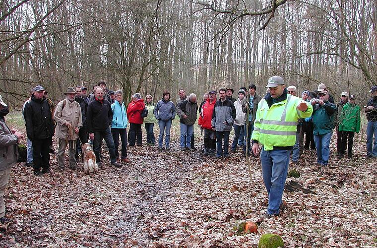 "In Grenzfragen helfen wir vor Ort als Dienst für die Bewohner." Den Rundgang hatten Fridolin und Alfred Schubert sowie Johannes Kessler vorbereitet: Sie hatten an zwei Tagen alle Grenzsteine freigelegt und mit farbigen Zusatz pflöcken markiert.