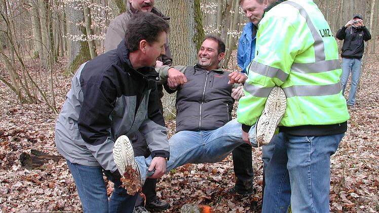 An einem "Dreimärker", an dem drei Gemarkungen zusammenstoßen, folgte das "Stauchen". Davon leite sich die Redensart "jemanden zusammenstauchen" ab, wie Erhard erklärte. Dies sei Mittel, um sich eine Sache einzuprägen. Feldgeschworene sollten sich die Grenzen sehr gut merken.