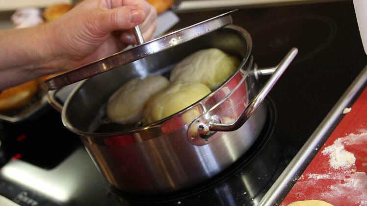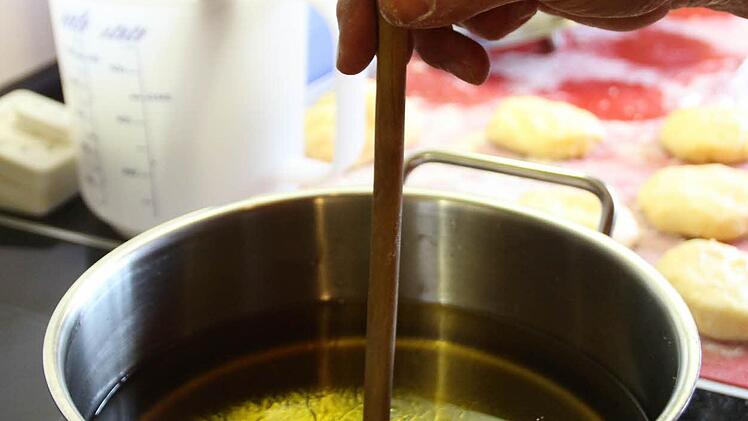 In einem silbernen Topf erhitzt Edeltraud Häusler das Pflanzenöl. "Das kann man gut zwei Mal benutzen. Einfach durch einen Kaffeefilter seihen." Der Löffeltest besagt es ist soweit, bei 160 bis 170 Grad blubbert das Öl um den Holzstil herum. Mit der Oberseite zuerst, versenkt sie drei Teiglinge darin. "Nicht zu viele, damit man die Übersicht nicht verliert. So saugen sie sich auch nicht so voller Fett." Deckel drauf und etwa zwei Minuten abwarten.