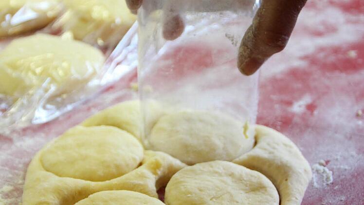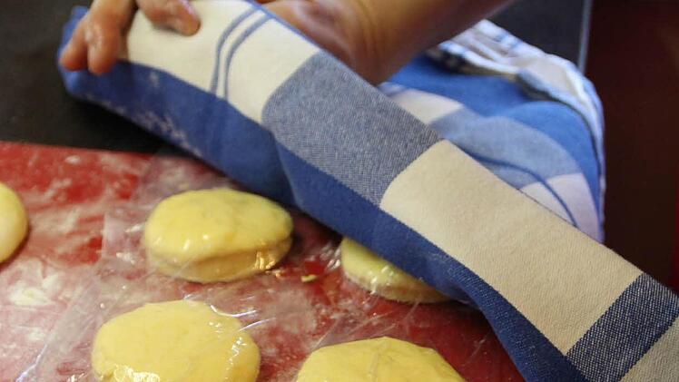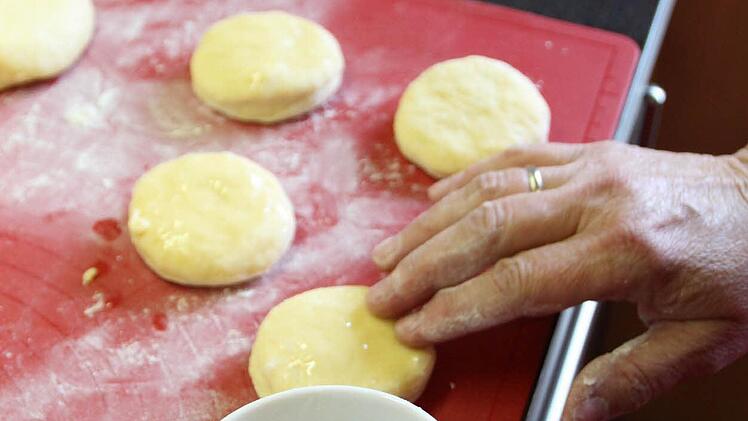 In der Ruhe liegt der Geschmack Nachdem der Hefeteig geruht hat, knetet sie ihn noch einmal durch und lässt ihn wieder eine halbe Stunde stehen. Dann kratzt sie den fluffigen Teig aus der Rührschüssel und rollt ihn auf einer Unterlage aus. Zwei Zentimeter dick. Ein Glas ist Formgeber. Die ausgestochenen Teiglinge bestreicht sie mit etwas Öl. "Dann bleiben sie geschmeidig und werden nicht rissig." Eine Frischhaltefolie und ein Tuch darüber und erneut für 30 Minuten gehen lassen.