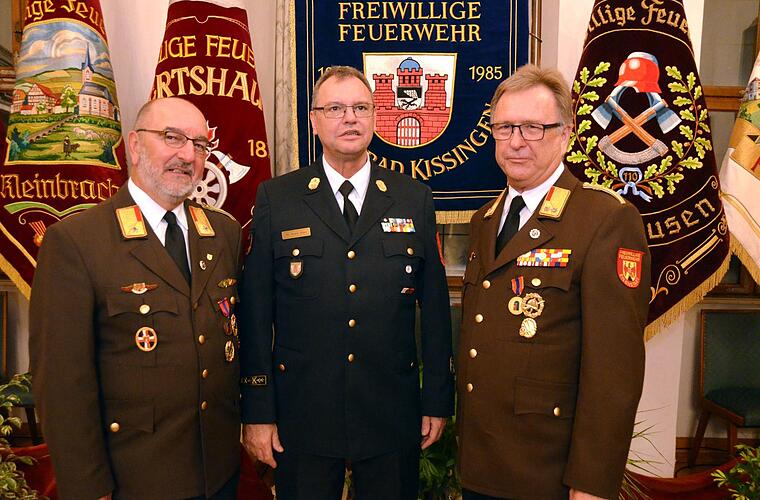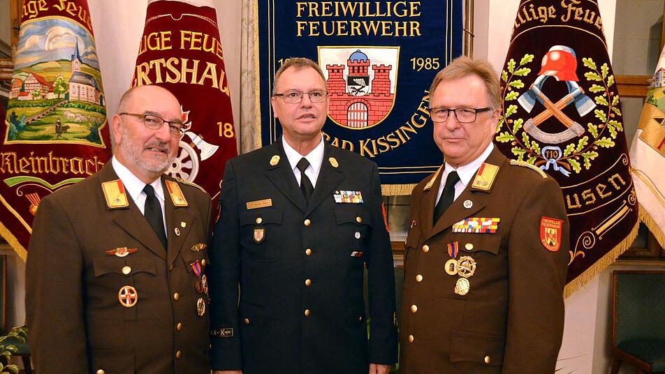 Gemeinsam überreichten Oberbürgermeister und stellvertretender Landrat das Staatliche Ehrenkreuz in Silber und Gold für 25 und 40 "Dienstjahre" in den Freiwilligen Feuerwehren der Stadt Bad Kissingen. Für 25 Jahre aktive Mitgliedschaft wurden geehrt: Michael Rüttinger (Albertshausen), Tobias Lutz (Arnshausen), Andreas Kröber und Michael Wolf (beide Bad Kissingen), Andreas Klauda (Garitz). Für 40 Jahre: Arno Kleinhenz (Albertshausen) und Ralf Schöniger (Hausen). Gerhard Schlereth (Kleinbrach), der aus dem aktiven Dienst verabschiedet wurde erhielt eine städtische Ehrung und ein Präsent. Die "Medaille für internationale Zusammenarbeit" des Deutschen Feuerwehrverbandes erhielten die beiden aus Eisenstadt in Österreich angereisten Feuerwehrkollegen Dieter Schirmer und Kurt Feichtinger.
