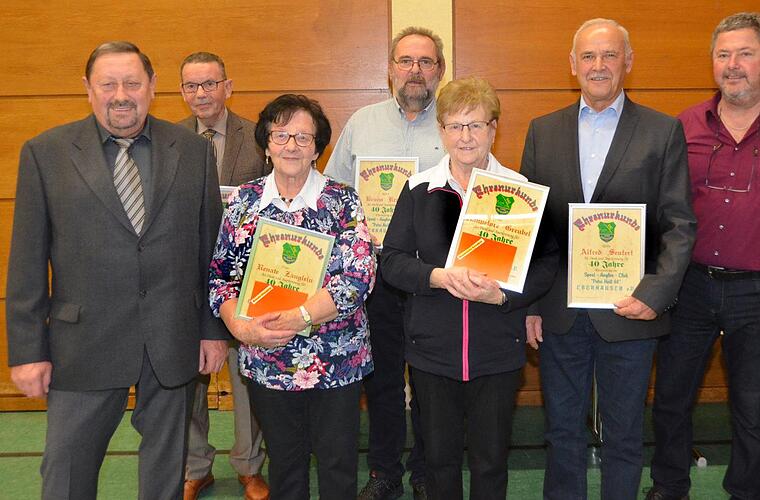 Vor allem aber den vielen freiwilligen Helfern beim Fischfest gebühre dieser Abend, der mit einem Essen begonnen wurde. Solch ein Abend, an dem fast alle Mitglieder anwesend seien, sei natürlich der ideale Rahmen für Vereinsehrungen. So rief Moderator Ernst Rudolf Alfred Seufert, Bruno Kraus, Hannelore Greubel, Herbert Völkel und Renate Zänglein nach vorne, um ihnen mit den beiden Vorsitzenden für ihre jeweils 40-jährige Vereinsmitgliedschaft zu danken und ihnen Urkunde und Präsente zu überreichen.