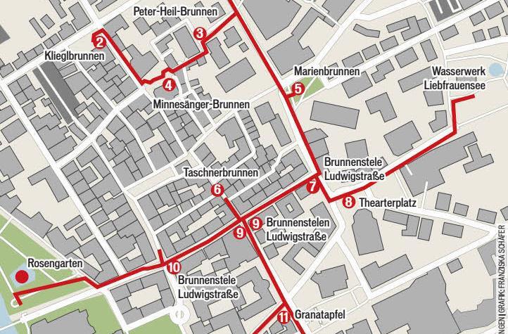 Theaterplatz: Der dortige Brunnen ist einer derjenigen, in denen das Wasser nur umgewälzt wird. Aus dem Liebfrauensee wird nur nachgefüllt, was verdunstet -oder versickert: "Das unterirdische Becken ist nicht mehr ganz dicht, wir wollten nicht, dass die Pumpen trocken laufen", sagt deshalb auch Richard Mauler von der Stadt.