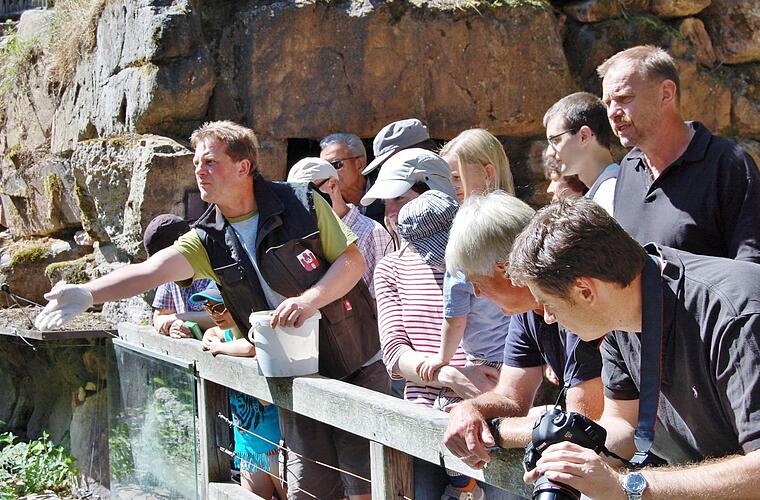 Die tägliche Schaufütterung ist weniger für die Tiere als eher für die Schaulustigen gedacht. "Unsere Besucher sollen eine emotionale Bindung zum Otter aufbauen", nennt Axel Maunz als Grund. "Nur dann werden sie sich künftig für den Schutz dieser Tiere einsetzen." Deshalb liegt dem Wildpark-Leiter auch die Zusammenarbeit mit der Universität Würzburg am Herzen: Pädagogik-Studenten am Lehrstuhl Biologie-Didaktik arbeiten während ihrer Lehramtsausbildung eng mit dem Klaushof zusammen und setzen dort ihre wissenschaftlichen Projektarbeiten in die Praxis um. So entstand auch 2010 der Fischotter-Lehrpfad, an dem das Wissen über den Otter vor allem an Kinder an mehreren Stationen abschnittsweise vermittelt wird. Gerade versucht die zehnjährige Johanna aus Bad Kissingen, mit Schwimmflossen-Modellen an den Händen wie ein Fischotter im Wasserbecken zu paddeln.