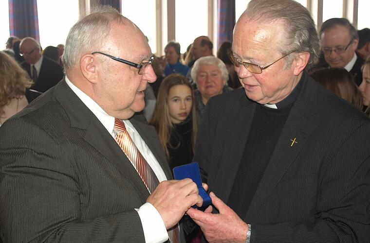 "Herr Pfarrer, Sie sind immer für uns da", sagte für die Pfarreiengemeinschaft Immanuel Vorsitzende Christiana Hackenberg. Bürgermeister Siegfried Erhard (CSU) ergänzte: "Weit mehr als die Hälfte Ihres Lebens sind Sie bei uns. Mit großem Engagement praktizieren Sie Tag für Tag Dienst für Gott und Menschen wie in Kindergarten, Schule und unseren vier Orten." Nach Bürgermedaille und Ehrenbürgerschaft kenne die Kommune keine weiteren Auszeichnungen. Neu geschaffen sei eine Verdienstnadel, die Erhard dem Jubilar ans Revers heftete.