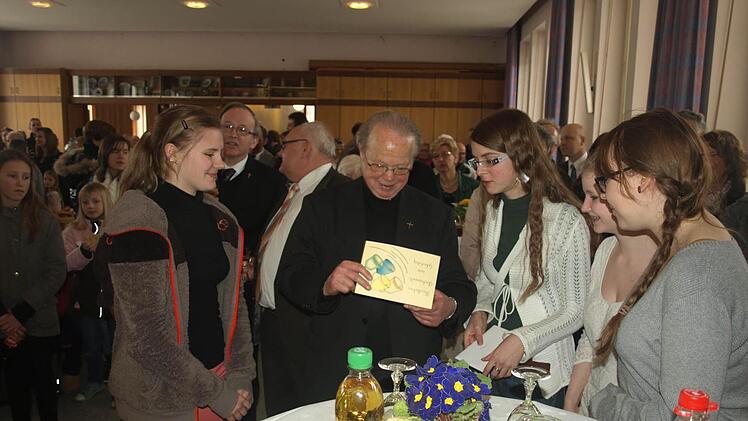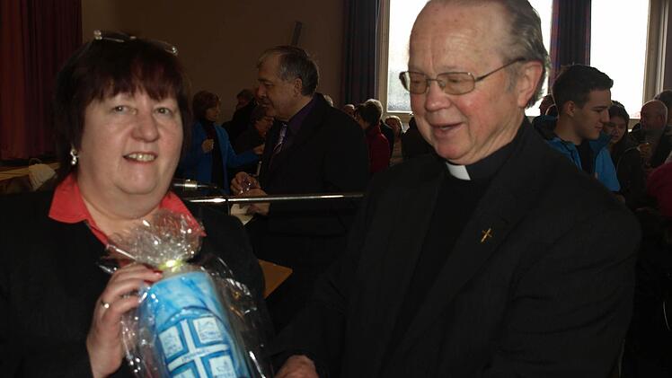 "Brauchen die Vereine den Pfarrer oder der Pfarrer die Vereine?", fragte Joachim Bauer für die mehr als 50 Vereine der Großgemeinde. Feste, Jubiläen, Prozessionen und Beerdigungen seien Berührungspunkte, die Pfarrer Amberg mit Offenheit und Verständnis angehe. Die ökumenische Zusammenarbeit hob Pfarrer Philipp Klein für die evangelische Kirchengemeinde hervor. Für die Ministranten gratulierte Anna Werner: "Herr Pfarrer, wir erfüllen Ihnen einen lang gehegten Wunsch: Sie bekommen von uns - wann und wo Sie können - einen exklusiven Einzel-Computerkurs bis zu Internet und Facebook."