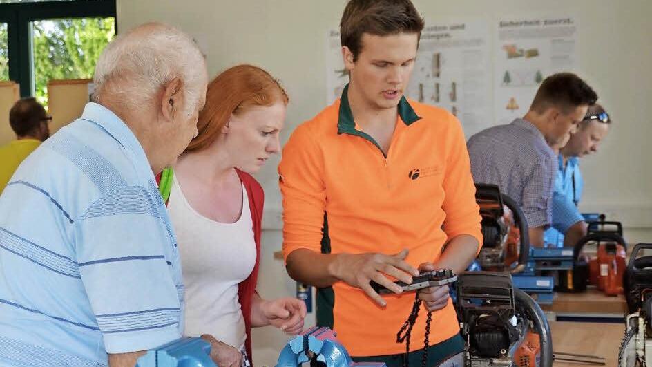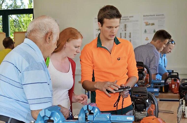 Am vergangenen Sonntag steht er in der neuen Ausbildungswerkstatt in Stangenroth und beantwortet Fragen, unter anderem zu den ausgestellten Motorsägen. "Welche ist nun besser, die von Stihl oder Husquvarna", will Besucherin Anna Viktoria Kaiser wissen, die aus Oehrberg stammt und selbst mit ihrem Mann "Holz macht". Das sei so ziemlich egal, antwortet Tim Hartung. Schließlich habe jede Maschine so ihre Vorzüge.
