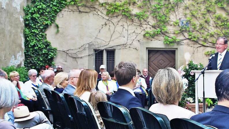 Der Auftakt zur Erinnerung an 60 Jahre Museen Schloss Aschach könnte stimmungsvoller kaum sein, weil auch Mitglieder von zwei Linien und drei Generationen aus dem Hause derer von Luxburg zur Gedenkfeier in den Schlosshof gekommen sind. Mit großer Freude begrüßt vom Präsidenten des Bezirkstages von Unterfranken, Erwin Dotzel, dem Repräsentanten des heutigen Eigentümers.