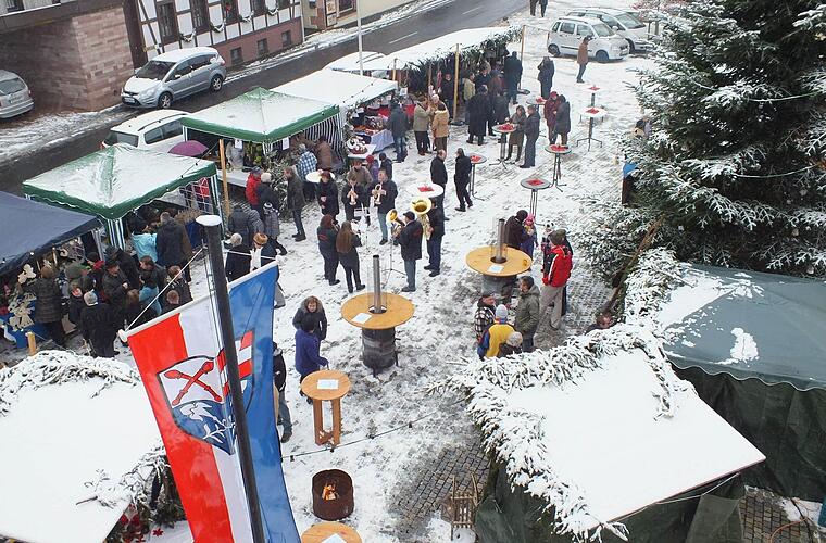 Appell des Bürgermeisters "Mit dem Plätzlesmoadd wollen wir am ersten Advent einstimmen auf die vorweihnachtliche Zeit. Gönnen wir uns am heutigen Tag schon etwas Ruhe. Suchen wir das Gespräch mit bekannten und unbekannten Gesichtern beim Markttreiben", lautete der Appell von Bürgermeister Waldemar Bug. Sichtlich begeistert waren die Besucher. Und auch Petrus, der die Weihnachtsbuden in weiße Watte gehüllt hatte, hat es gut mit den Burkardrothern gemeint.