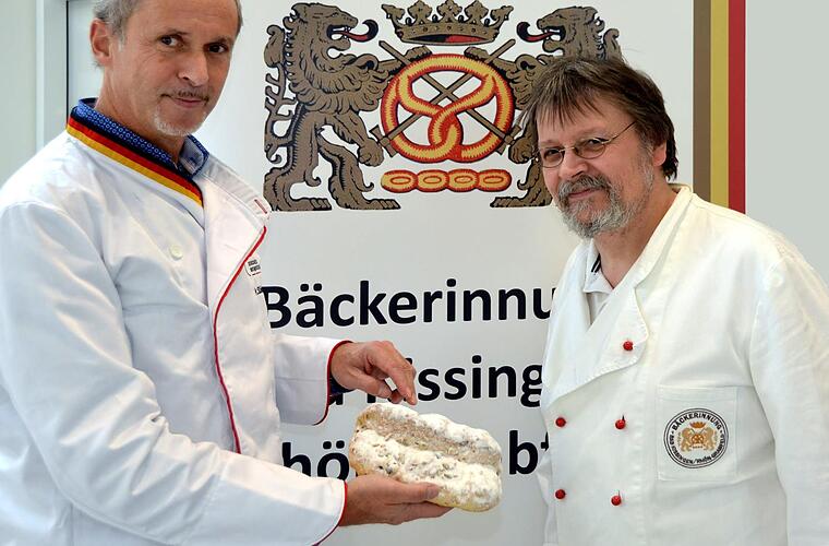 Ende Oktober, Anfang November beginnt bei den handwerklich organisierten Bäckereien die Stollenproduktion. "Ein guter Stollen muss reifen" erklärt Bäckermeister Heribert Hedrich, der gleichzeitig für die Innung Bad Kissingen und Rhön-Grabfeld als stellvertretender Innungsobermeister fungiert. Allerdings, "einen guten Stollen könne man ruhig auch schon an Allerheiligen essen, da komme meist die Familie zusammen, und man unterhalte sich nach dem Friedhofsbesuch über die Verstorbenen der letzten Jahre, und das falle bei Kaffee und Stollen leichter", so der engagierte Bäcker. Welche Stollen gut oder sogar sehr gut sind, beurteilt für viele Innungen das Deutsche Brotinstitut. Für die Bäckerinnung Bad Kissingen fand im Sparkassengebäude eine öffentliche Stollenprüfung durch Manfred Stiefel statt. Sparkassenkunden konnten sich von der Qualität der insgesamt 14 zur Prüfung eingereichten Stollen optisch und auch geschmacklich ebenso ein Bild machen wie der Prüfer. Und, um es vorwegzunehmen, alle eingereichten Stollen wurden geprüft, das bedeutet, alle Stollen erhielten ein "Gut", neun Stück sogar ein "Sehr Gut". "Höchste Qualität, beste Rohstoffe und natürlich auch etwas Leidenschaft beim Backen sind dafür nötig", so Bäckermeister Hedrich.