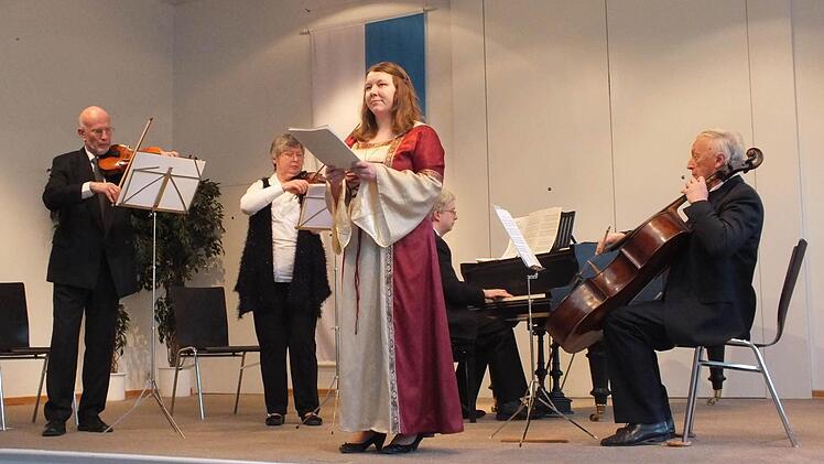 Nach der Pause stand unter anderem das Concerto 7 aus dem Opus IV auf dem Programm. Berthold Gaß (Klavier), Carola Kroczek und Reinhard Wilimsky (Violine) sowie Erik Wiesner (Cello) gaben dieses interessante Stück Rathgebers zum Besten. Weitere Weisen folgten. Und als Sängerin Susanne Handwerker - natürlich nur gespielt - sich zu singen weigerte, musste das Publikum einspringen und selbst dafür sorgen, dass es mit dem "Alleweil ein wenig