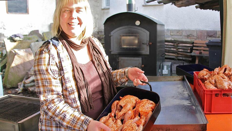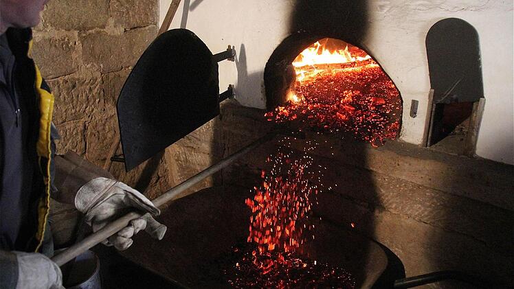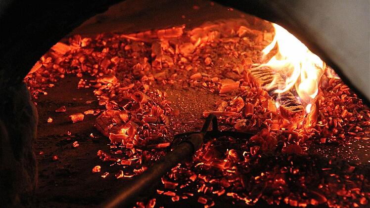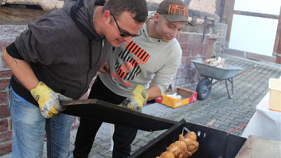 Pizza und Zwiebelplootz kommen auch aus dem Backofen am alten Feuerwehrhaus an der Hauptstraße in Wartmannsroth. Die werden von den zehn fleißigen Helfern des MoMo-Clubs auf den alten, 50 Zentimeter großen Rundblechen aus der historischen Schmiede von Kilian Martin gereicht. Die Riesenpizza reicht für drei bis sechs Personen - je nach Hunger.