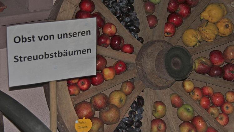 "Apfelbratwürscht" locken nach Neuwirtshaus zu "Bold´s Schnapsideen". Dort zeigt Ingrid Bold die kleinen runden Süßbirnen, eine fränkische Spezialität als alte Streuobstsorte, aus der Birnenbrand entsteht. "Ein Doppelzentner Obst ergibt maximal zehn Liter Schnaps", erläutert sie.