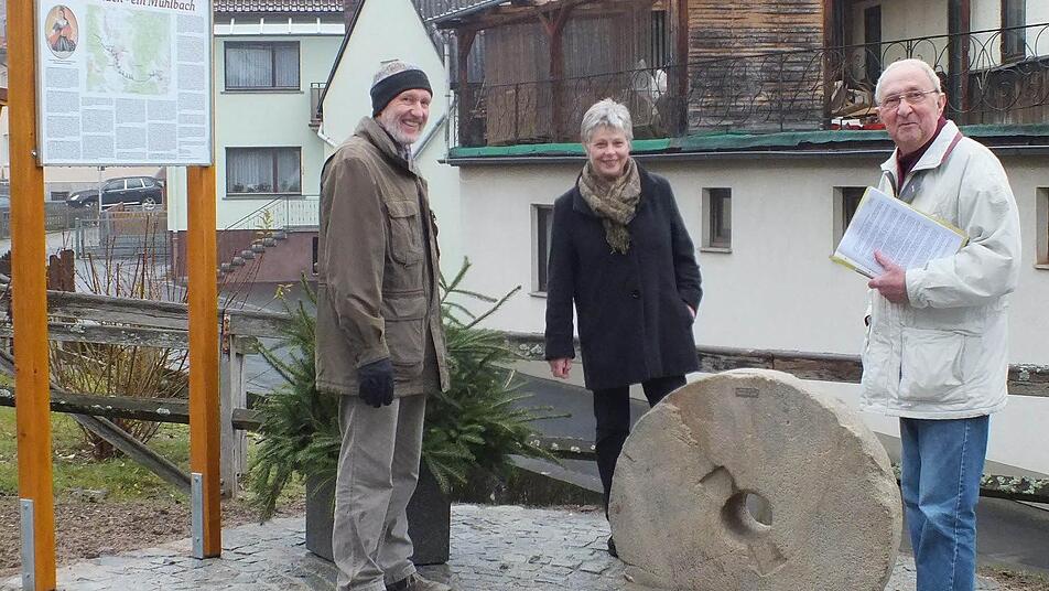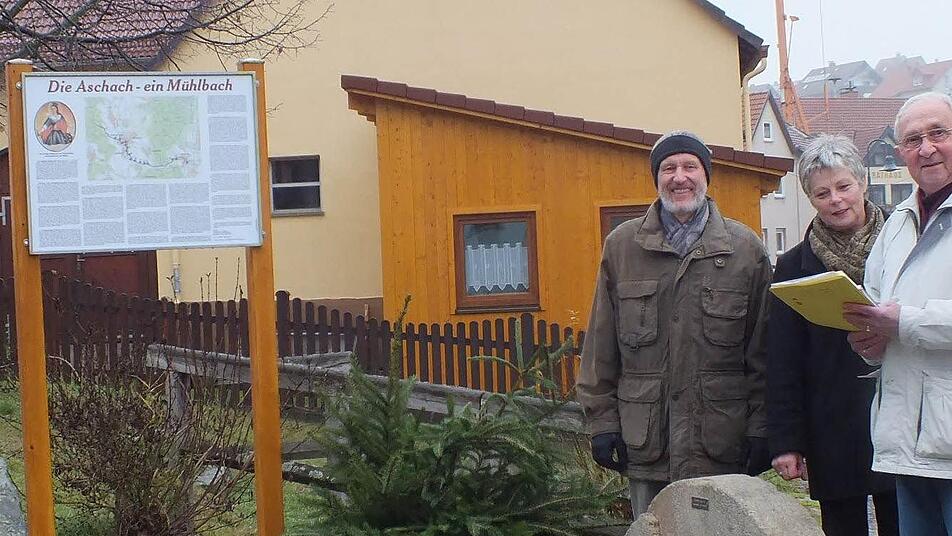 Viel Arbeit nahmen die Mühlen den Menschen ab, als die Muskelkraft von Tier und Mensch meist die einzige Energiequelle war. "Ich freue mich, dass wir heute dieses Denkmal einweihen können", sagte Bürgermeister Waldemar Bug (ödp), der mit 3. Bürgermeisterin Elisabeth Kuhn (CSU) vor Ort war. Eine Tafel beschreibt 16 Mühlen entlang der Aschach - drei in Aschach, 13 in Burkardroth.