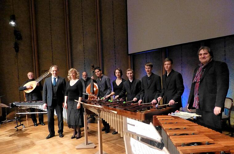 Selbstbewusstes Spiel Doch zeigten sie, etwa Michael Nöth bei den gebrochenen Akkorden in der Begleitung des Beethovenliedes, dass sie mit ihrem Instrument die Eindringlichkeit eines Klaviers durchaus erreichen können. Aber sie schafften es auch, im orchestralen Zusammenspiel mit zwei und drei Marimbaphonen der aufgrund der unterschiedlichen Instrumente differenzierten Textur eines Kammerorchesters ihre ganz anders geartete Tonsprache selbstbewusst entgegensetzen.