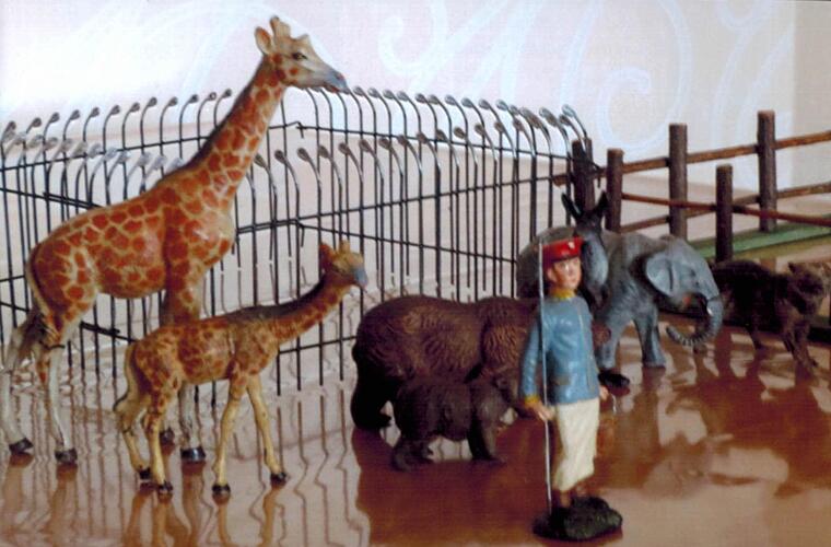 beglückt. Nun, zwei Jahre nach dem Tod ihres Mannes, brachte sie dessen "Zoo", also gut zwei Dutzend exotische Tiere samt Wärter und Gehege nach Bad Kissingen damit die Tiere hier im Spielzeugmuseum eine neue Heimat finden. "Als Kind hat mein Mann gerne damit gespielt, viel gab es ja in den ersten Nachkriegsjahren nicht und da waren solche Figuren aus Elastolin, manche sagen auch Plastolin dazu, wirklich etwas Exotisches".