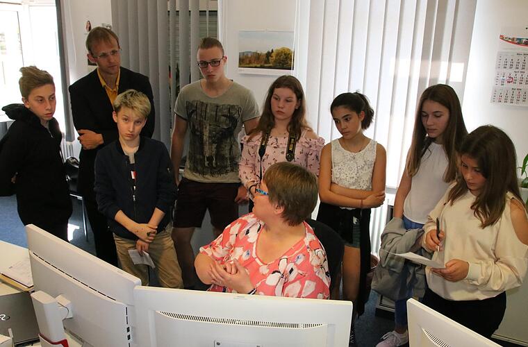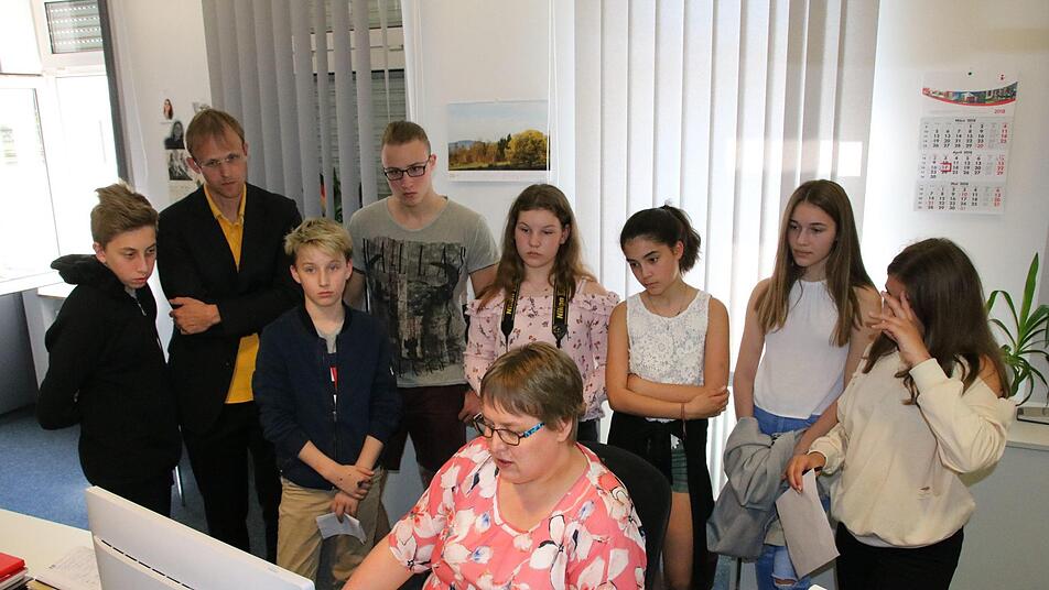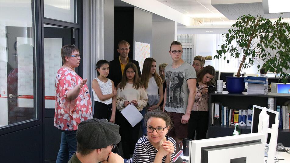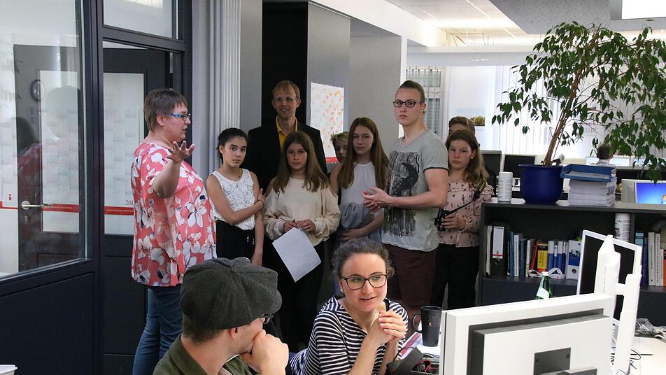 In der Redaktion der Saale-Zeitung informierte die stellvertretende Redaktionsleiterin Annett Lüdeke über den Tagesablauf. Die Schüler waren überrascht, dass im Verlag rund um die Uhr immer jemand arbeitet: vom Druck der Zeitung in der Nacht über das Austragen am Morgen bis zum Schreiben der Berichte und Layouten der Seiten. Und selbst wenn die Zeitung bereits fertig ist, werden aktuelle Berichte noch online gestellt. Auch die Kontakte zur Polizei, die Zusammenarbeit mit Behörden oder die Planung von Terminen und Themen kamen zur Sprache. "Ich habe gar nicht gewusst, wie hier so gearbeitet wird", fasste Jette Reuß am Ende ihre Eindrücke zusammen.