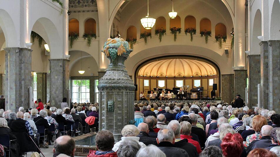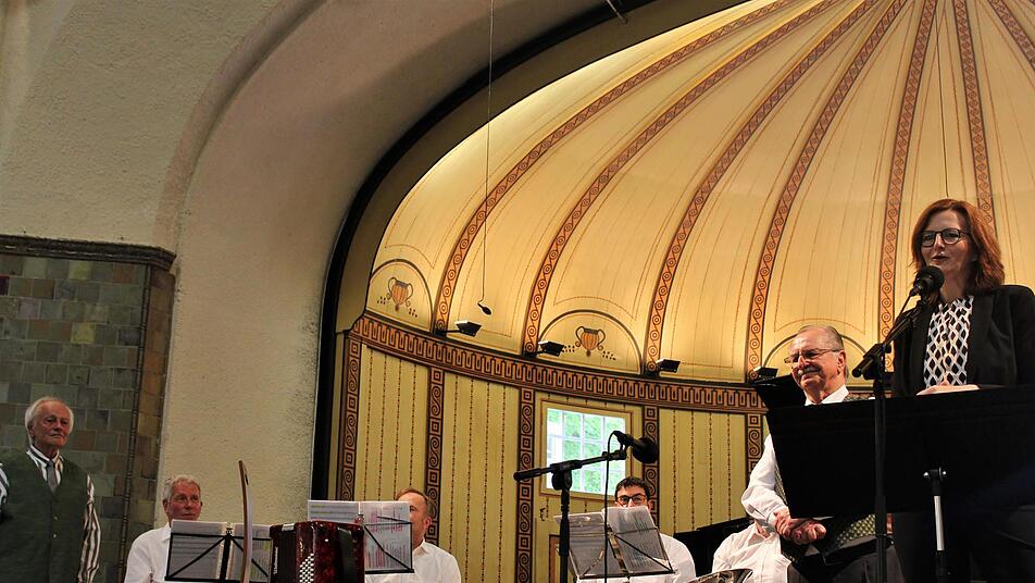Kurdirektorin Sylvie Thormann gab gerne zu, dass ihr das Herz aufgehe, wenn sie die großartige Wandelhalle restlos gefüllt erlebt, sie freutr sich über Gesang als Publikumsmagnet und gratulierte Edmund Seller und Robert Bauch stilvoll mit als Notenschlüsseln gestalteten Schokoladenkreationen. Die beiden dankten verschmitzt fränkisch: "Des hätt's fei net gebraucht".