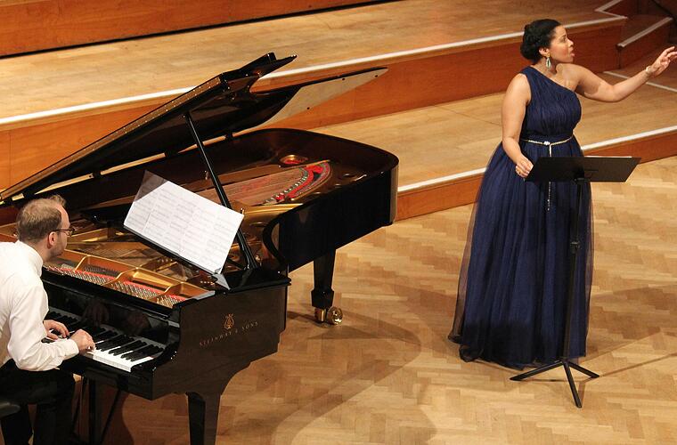Der Liederabend im Max-Littmann-Saal beginnt wunderbar innig mit dem Schweinfurter Spätromantiker Friedrich Rückert: "Liebst du um Schönheit, o nicht mich liebe!" heißt es da. Nicht um ihrer Schönheit oder Jugend, einzig ihrer Liebe willen, möchte sie geliebt werden. Clara Schumanns zweifelnde Melodie nimmt Golda Schultz, formuliert sie mit weichem Ansatz ihres runden, klaren Soprans auf. Weil sie perfekt Deutsch spricht, wirkt das absolut authentisch. Leichter, träumerisch schwebend, ihre Gestaltung bei Rückerts: "Am Strande".