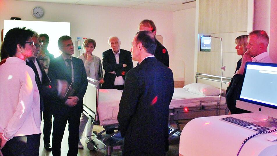 Dritter Bürgermeister Thoma Leiner (CSU), stellvertretender Landrat Emil Müller (CSU), Pfarrer Gerd Greier, Sparkassendirektor Roland Friedrich und die Besucher der Vernissage besichtigen in kleinen Gruppen die Intensivstation. Ein wenig Beklemmung ist da schon zu spüren. "Wenn es heißt, wir haben den Patienten in die Intensivstation aufgenommen, sind Angehörige schockiert", meint Thomas Leiner. Intensiv, das heißt doch Isolation und Überwachung rund um die Uhr, bedeutet, Apparate, Infusionsschläuche und leuchtende Monitordiagramme. Der Mensch scheint Objekt der Apparatemedizin.