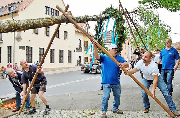 schon am Freitagnachmittag junge Männer aus der Gemeinde, angeführt von der Jugendblaskapelle, den 17 Meter hohen Birkenstamm im Festzug mit Trecker und Wagen zum Dorfplatz. "Höher darf er aus Sicherheitsgründen nicht sein", erklärte Herterich. Mit langen Stangenpaaren stemmten 15 Männer den Baum nach und nach in die Senkrechte und versenkten ihn 1,50 Meter tief in die Eisenhalterung im Boden.