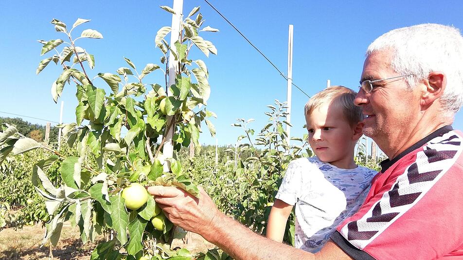 Die ersten Äpfel, die in dieser Sommersaison in Schmitt´s Obstgarten geerntet werden, sehen aus wie gemalt. Rotbackig und prall liegen sie in den Körben. Claus Schmitt freut dieser Anblick, denn die Frühsorte scheint die lange Trockenheit noch recht gut weggesteckt zu haben. Doch nur wenige Meter entfernt stehen Apfelbäume, denen der Trockenstress deutlich anzusehen ist. Die Blätter rollen sich bereits ein, ein typisches Zeichen, dass der Baum Durst hat. Claus Schmitt sorgt sich um seine Obstbaumkulturen und steht mit seiner Sorge nicht alleine