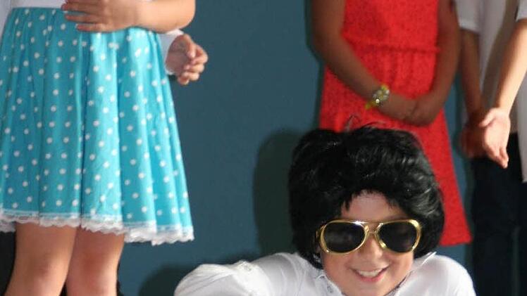 Und dann kam er: Elvis Presley im Miniformat brachte mit "Devil in Desguise" die Halle zum Kreischen. Dazu legten die Mädchen der 8. Klasse in Petticoats mit Tüpfelblusen eine wirbelnde Show aufs Parkett und ernteten stürmischen Applaus, als sie auch noch Bürgermeister Günter Kiesel auf die Bühne holten.