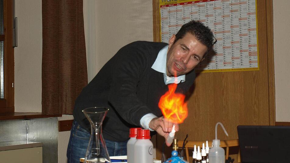 "Heute haben wir vorrangig Energiesparlampen mit Startern und Gasentladung, um hohe Spannungen aufzubauen. Dabei werden verschiedene Chloride eingesetzt. Je nach Metall wie Natrium oder Barium kann die Lichtfarbe gewählt werden", informierte er, ehe er mit Versuchen verschiedene Farben und das Fluoreszieren zeigte.