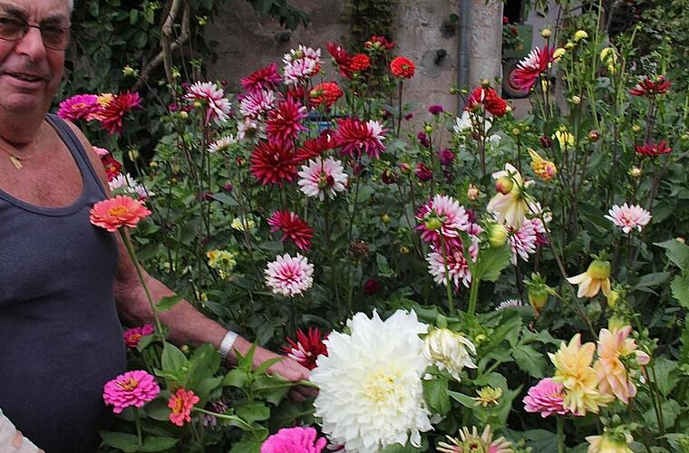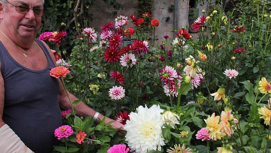 Ägidius Troll aus Wartmannsroth freut sich über die stattliche Dahlie. Der Blütenkopf hat einen Durchmesser von 26 Zentimetern, hat er nachgemessen. Auch sonst grünt und blüht es prächtig in dem fränkischen Garten der Trolls. Foto: Gerd Schaar