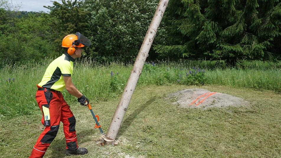 Der perfekte und routinierte Umgang mit dem Werkzeug sowie Zielgenauigkeit und Schnelligkeit wurde beim Zielbaumfällen unter Beweis gestellt. Eine 4,5 Meter hohe Fichte musste in einen 3,5 Meter entfernten 20 Zentimeter breiten Zielbereich gefällt werden. Dazu war der fachliche Fällschnitt anzuwenden, Maß und Zielgenauigkeit wurden bewertet. 60 Sekunden standen zur Verfügung. Felix Dürr gelang eine Punktlandung, allerdings war er mit zwei Sekunden über die Zeit gekommen, was ihm fünf Minuspunkte einbrachte.