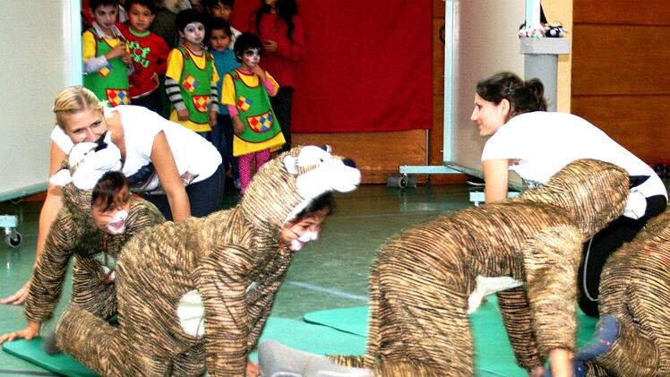 Gestik und Mimik eine Löwennummer mit fünf Kindern aus dem Kosovo einstudiert. Selmira, Sanella und Samira, die ältesten der Mädchen, zeigte Purzelbaum und Handstand, und hatten ihren kleinen Geschwistern einfache Klettereien beigebracht. Fertig war eine viel beklatschte Löwendressur.