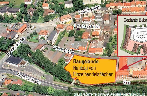 Satteldächer und Holz-Fassaden "Wir werden versuchen, das mit einer zeitlosen Architektur-Sprache zu gestalten", beschrieb Graf das Vorhaben. Die Läden sind auf zwei Baukörper verteilt, die wiederum mehrfach abgesetzt sind. Einbezogen werde auch die Umgebung: "Die vorhandene Brücke zieht sich als Fußweg duch die Anlage hindurch", verwies er auf die Verbindung zwischen Sinn und Sinnaustraße. Gleichzeitig soll das Wasser aber keinen Weg in die Anlage finden: "Das ganze Niveau ist aus der Hochwasserzone herausgenommen." Das Gelände werde also soweit aufgefüllt, dass es auf einer Höhe mit der Sinnaustraße liegt.