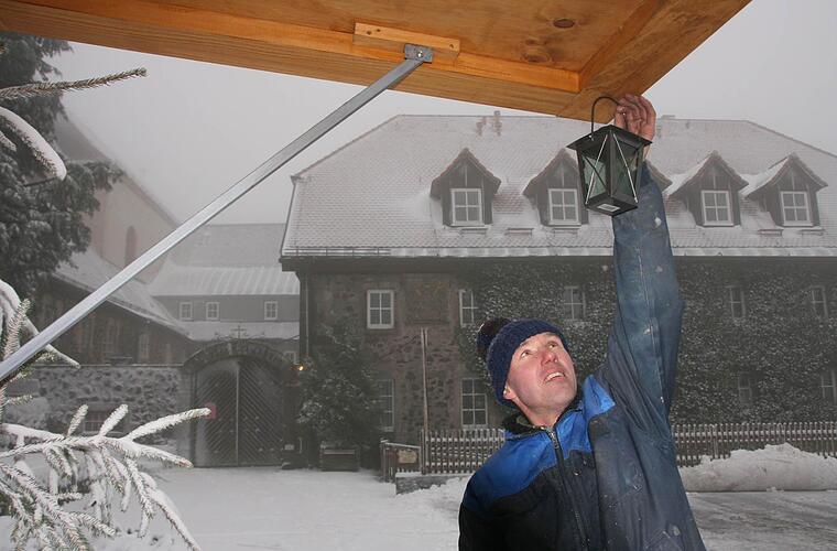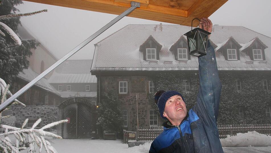 Stefan Vorndran ist über die weiße Pracht geteilter Meinung. Der Kloster-Angestellte vom Kreuzberg ist damit beschäftigt, für den Weihnachtsmarkt - Freitagnachmittag bis Sonntag - die Holzbuden mit Strom und Lichtern auszustatten. "Ich brauch' den Schnee nicht", sagt er etwas missmutig. Den Einwand, dass der Schnee dem Weihnachtsmarkt doch mehr Flair verleiht, lässt er gelten. Aber trotzdem.
